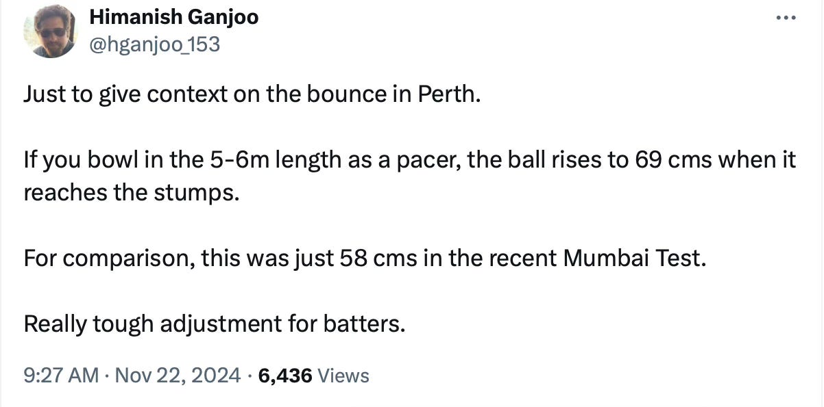 India were coming off a shock 0-3 loss to New Zealand at home. Injuries and unavailability meant only 5 players in the Indian squad had visited Australian shores (with the senior team) more than once. Imagine playing on a pitch that bounces 11 cms more (on average) from the same length as the previous pitch.