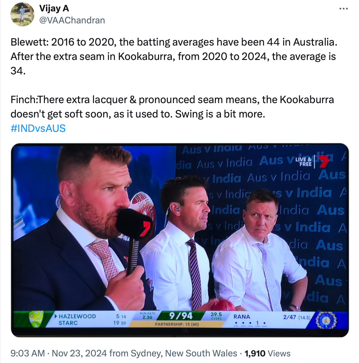 Greg Blewett’s comment on air is an important one to keep in mind. Just like a different batch of duke balls used during the summer of 2022 changed the dynamics of the matches played in England, the changes to the Kookaburra ball has made batting substantially tougher in Australia.